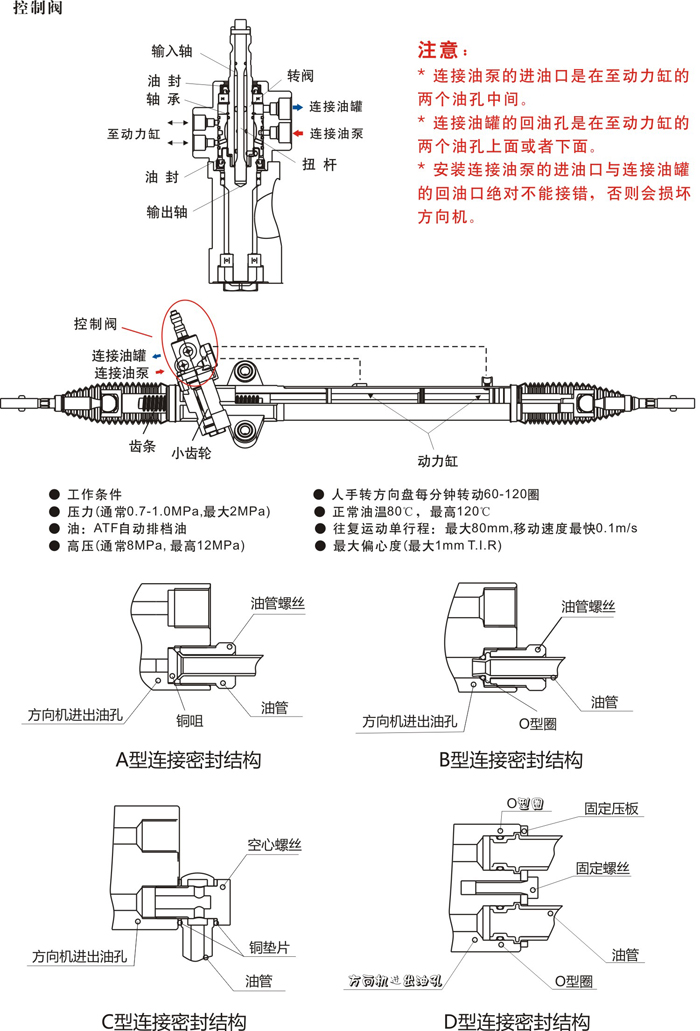 注意:油管應正確安裝。不要混淆進口與出口,否則動力轉向裝置將受到損害。始終保持動力轉向裝置的內部清潔。動力轉向裝置是由驅動油泵的汽車引擎,所以汽車熄火時不能滑動,否則它造成轉向問題。司機不能把動力轉向裝置的極限超過5秒。請把它當你把它的極限,否則油泵可能受損。線軸被調整到最佳狀態,其他部分不應該被拆除。油封和垃圾環時拆除修復不應再使用。石油加油應該和原來的一樣。如果液壓系統壞了,不能工作,司機應該增加力量,旋轉汽車暫時。組裝和拆卸動力轉向系統時,請不要罷工或者部分強烈,請保持干凈,禁止任何外國材料轉向系統。