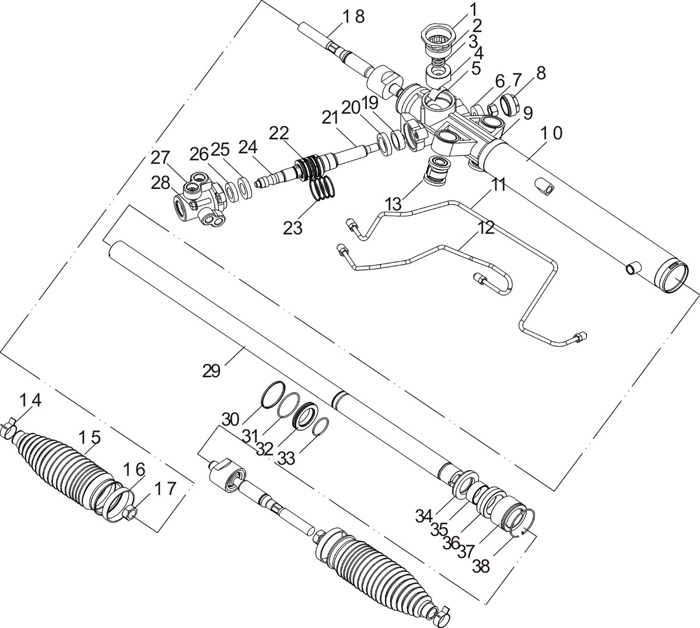 1、調整螺母 2、調整螺絲 3、調整彈簧 4、調整半圓 5、調整半圓墊片 6、下殼軸承 7、端蓋螺母 8、端蓋螺絲 9、下殼體 10、油缸總成 11、長油管 12、短油管 13、機腳總成 14、管箍 15、齒條防塵罩 16、環箍 17、拉桿螺母 18、內拉桿總成 19、閥齒軸承 20、閥齒油封 21、閥齒 22、閥體 23、閥體塑料王圈 24、閥芯 25、上殼軸承 26、上殼油封 27、上殼體 28、上下殼連接螺絲 29、齒條 30、活塞塑料王圈 31、活塞O型圈 32、活塞 33、活塞卡簧 34、高壓油封 35、滑動軸承 36、油缸油封鐵套1 37、油缸油封鐵套2 38、油缸卡簧